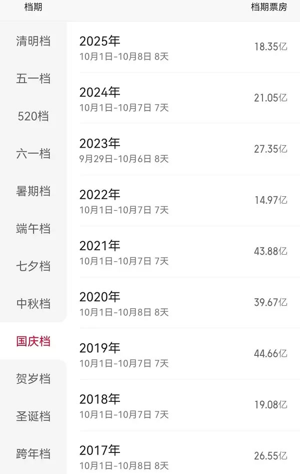 如果除去情況特殊的2022年,2025年國慶檔票房創(chuàng )了2017年以來(lái)的新低。