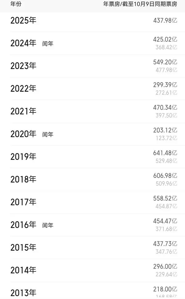 這跟影市大盤(pán)是同步的,2023年全國電影票房549億元,2024年跌到了425億元,2025年要不是《哪吒2》單片的爆火救活了上半年影市,今年全年票房預計也會(huì )同比下滑。