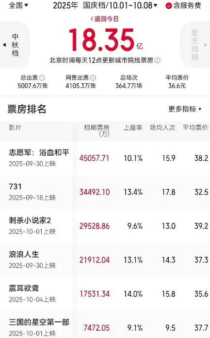 十年前的2015年,國慶檔票房18.59億元,那時(shí)售票平臺的服務(wù)費還沒(méi)有計入票房統計。如果不計“服務(wù)費”,2025年國慶檔票房16.41億元,遠不如2015年國慶檔。