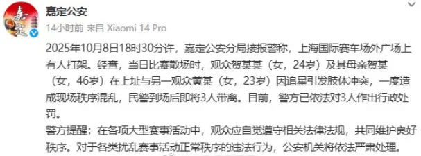 通報內容稱(chēng) :“2025年10月8日18時(shí)30分許,嘉定公安分局接報警稱(chēng),上海國際賽車(chē)場(chǎng)外廣場(chǎng)上有人打架。經(jīng)查,當日比賽散場(chǎng)時(shí),觀(guān)眾賀某某(女,24歲)及其母親賀某(女,46歲)在上址與另一觀(guān)眾黃某(女,23歲)因追星引發(fā)肢體沖突,一度造成現場(chǎng)秩序混亂,民警到場(chǎng)后即將3人帶離。目前,警方已依法對3人作出行政處罰。警方提醒:在各項大型賽事活動(dòng)中,觀(guān)眾應自覺(jué)遵守相關(guān)法律法規,共同維護良好秩序。對于各類(lèi)擾亂賽事活動(dòng)正常秩序的違法行為,公安機關(guān)將依法嚴肅處理。”