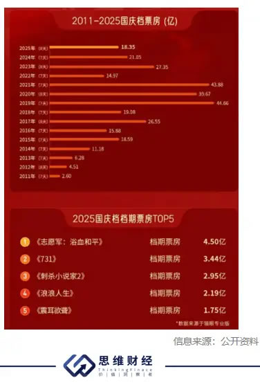國慶長(cháng)假,電影市場(chǎng)再度迎來(lái)“黃金檔”。據中國國家電影局數據,2025年中國內地國慶檔(10月1日至10月8日)總票房18.35億元,觀(guān)影總人次5007萬(wàn),國產(chǎn)影片票房占比為98.93%!吨驹杠姡涸⊙推健贰731》《刺殺小說(shuō)家2》《浪浪人生》《震耳欲聾》暫列票房前五名,且各片檔期票房均突破1億元。