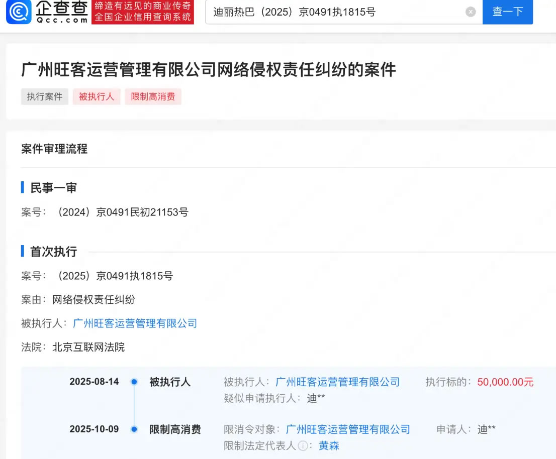 據企查查信息,迪麗熱巴與一奶茶品牌網(wǎng)絡(luò )侵權責任糾紛新增限制消費令,8月該公司已因此案被強制執行5萬(wàn)元。此前多個(gè)網(wǎng)友曾在社交平臺曬出迪麗熱巴與該奶茶的相關(guān)物料。
