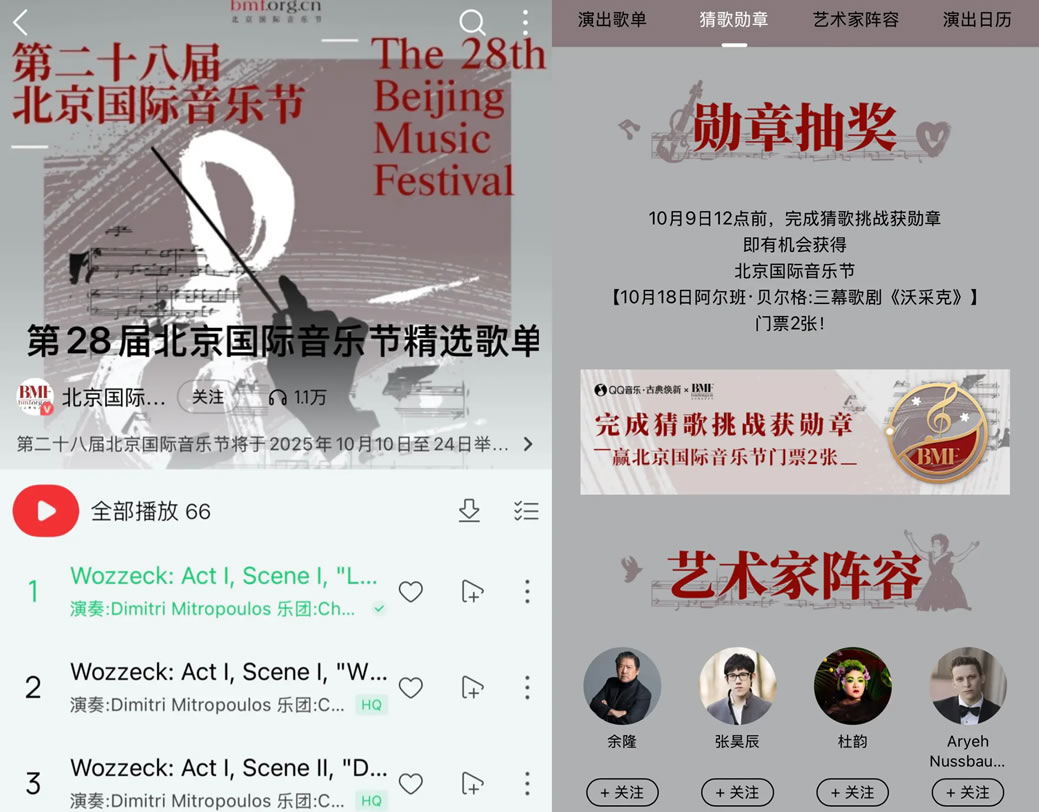 QQ音樂(lè )·國樂(lè )煥新為本屆北京國際音樂(lè )節特別打造了線(xiàn)上音樂(lè )節專(zhuān)區,讓你隨時(shí)隨地參與這場(chǎng)藝術(shù)盛會(huì )。只需打開(kāi)QQ音樂(lè )APP,搜索“北京國際音樂(lè )節”,即可進(jìn)入一個(gè)豐富多彩的古典音樂(lè )世界。專(zhuān)區內有QQ音樂(lè )獨家呈現的多場(chǎng)精彩演出的高清音視頻,讓你在線(xiàn)上也能直擊無(wú)界古典的震撼現場(chǎng),感受這份世界級音樂(lè )品質(zhì)。同時(shí)還有藝術(shù)名家精心打造的專(zhuān)屬歌單,聆聽(tīng)藝術(shù)家精心挑選的曲目列表,仿佛置身于一場(chǎng)私人音樂(lè )沙龍,從創(chuàng )作者獨特的藝術(shù)視角重新認識古典音樂(lè )的魅力。此外,QQ音樂(lè )還打造了一系列趣味互動(dòng)玩法,帶你踏上一場(chǎng)妙趣橫生的古典音樂(lè )探索之旅。專(zhuān)區內不僅有古典音樂(lè )知識科普及互動(dòng)話(huà)題討論,鼓勵用戶(hù)積極參與、分享見(jiàn)解,在交流中深化對古典藝術(shù)的理解,同時(shí)還特別打造猜歌挑戰,可通過(guò)聆聽(tīng)古典音樂(lè )經(jīng)典曲目片段,猜出曲名或作曲家。解鎖正確答案將有機會(huì )贏(yíng)得精心設計的北京國際音樂(lè )節專(zhuān)屬音樂(lè )勛章。這些限量版音樂(lè )勛章,不僅是你在古典音樂(lè )圣殿探索足跡的珍貴記錄,更可收藏或分享,展現你的音樂(lè )品味與知識積累。