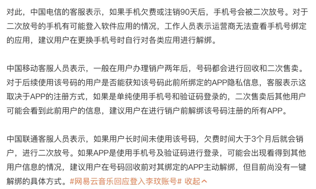 針對“二次放號”問(wèn)題,也有媒體采訪(fǎng)到三家運營(yíng)商,客服人員均表示,建議用戶(hù)在銷(xiāo)戶(hù)前對注冊的各類(lèi)APP主動(dòng)解綁。