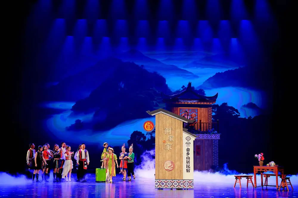 《阿家家》由景寧畬族自治縣文化館、麗水市文化館、浙江省潘力峰畬族音樂(lè )創(chuàng )作導師工作室聯(lián)合創(chuàng )作編排,以畬鄉農文旅融合為題材,既保留了畬歌的原始韻味,又大膽融入輕搖滾節奏,讓古老的畬音煥發(fā)出青春活力。“阿家家”在畬語(yǔ)中意為“奶奶的家”,既是畬寨民宿的縮影,更是畬鄉萬(wàn)千家庭的代表!栋⒓壹摇非擅钊诤狭顺两轿枧_,以畬寨特色民宿“阿家家”為敘事空間,通過(guò)“斑鳩唱霞”勾勒詩(shī)意畬鄉,借由“鳳凰裝”與“直播架”架起傳統與現代的橋梁。畬漢雙語(yǔ)的深情交融,在激昂的嗩吶與搖滾節奏中共振升華,生動(dòng)勾勒出新時(shí)代景寧文旅富民產(chǎn)業(yè)繁榮發(fā)展與城鄉畬漢雙向奔赴的鄉村振興圖景。
