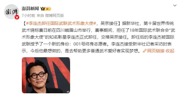 據新華社,第十屆世界傳統武術(shù)錦標賽日前在四川峨眉山市舉行,賽事期間,擔任了18年國際武術(shù)聯(lián)合會(huì )“武術(shù)形象大使”的知名影星李連杰正式卸任,交棒吳京接任。卸任后的李連杰被國際武聯(lián)授予了一個(gè)新的身份:001號終身志愿者。李連杰接受新華社記者采訪(fǎng)時(shí)表示,今后他最想做的,是去幫助更多普通武術(shù)愛(ài)好者實(shí)現夢(mèng)想。