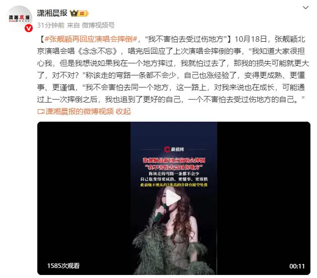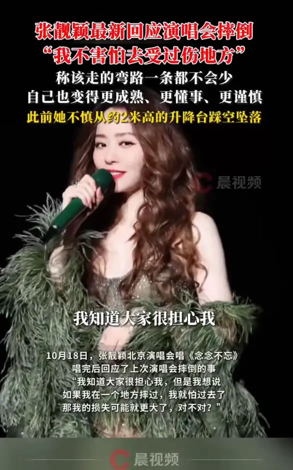 10月18日,張靚穎在北京演唱會(huì )唱《念念不忘》,唱完后回應了上次在演唱會(huì )摔倒的事,“我知道大家很擔心我,但是我想說(shuō)如果我在一個(gè)地方摔過(guò),我就怕過(guò)去了,那我的損失可能就更大了,對不對?”