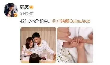 剛剛,韓庚、盧靖姍發(fā)一家四口合照、牽手照,并配文:“我們的‘好’消息”,官宣二胎得子。