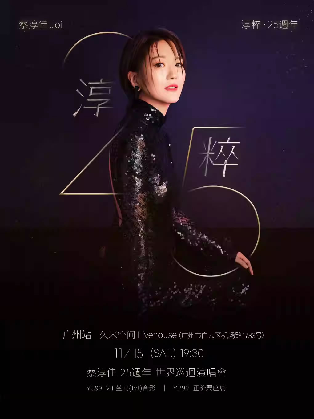 2025年,蔡淳佳,這位以淳澈嗓音治愈無(wú)數人的歌手,迎來(lái)了她音樂(lè )旅程出道25周年的紀念。在這個(gè)承載著(zhù)歌手音樂(lè )初心與樂(lè )迷青春記憶的特殊節點(diǎn),蔡淳佳正式官宣“淳粹・25周年 —— 蔡淳佳Joi出道紀念世界巡回演唱會(huì )”即將開(kāi)啟,消息一出便在樂(lè )迷社群引發(fā)熱烈反響,不少網(wǎng)友留言“終于等到這一天,要帶著(zhù)青春去赴約”。