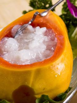 將重0.7公斤左右的木瓜頂部切去2/5做蓋,挖出木瓜的核和瓜瓤做盅。將冰糖和水一起煲溶后,放入洗凈的雪蛤膏煲半小時(shí),加入鮮奶,滾后注入木瓜盅內,加蓋,用牙簽插實(shí)木瓜蓋,隔水燉一小時(shí)即可。木瓜香滑,雪蛤晶瑩透亮,有潤膚養顏的功效。