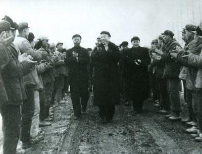 1952年王震(中)在陶峙岳(右)、羅汝正(左,師長(cháng))陪同下視察二十二兵團九軍二十六師(后兵團農八師)。