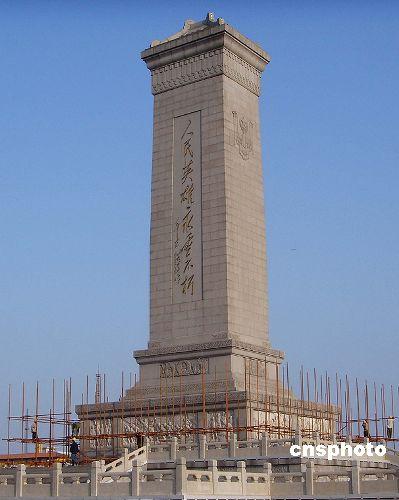 資料圖:2006年6月15日,有關(guān)施工人員開(kāi)始在北京人民英雄紀念碑四周搭建絞手架,對紀念碑碑體進(jìn)行全面清洗工作。 中新社發(fā) 玉龍 攝