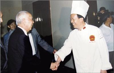 上世紀90年代,時(shí)任全國人大常委會(huì )委員長(cháng)萬(wàn)里慰問(wèn)時(shí)任人民大會(huì )堂總廚師長(cháng)孫應武。