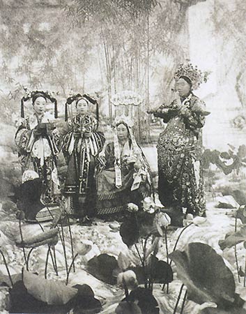 慈禧扮觀(guān)世音。左起:四格格,慈禧,李連英。觀(guān)世音菩薩,是菩薩當中知名度最高的,無(wú)人不知,無(wú)人不曉。她的名氣甚至超過(guò)了釋迦牟尼佛。佛界的四大菩薩,地藏王菩薩、文殊菩薩、普賢菩薩和觀(guān)世音菩薩,其中觀(guān)世音菩薩的地位是最高的。世人最崇拜的是觀(guān)世音菩薩。人們認為觀(guān)世音菩薩法力無(wú)邊,大慈大悲,救苦救難。慈禧即以觀(guān)世音菩薩自居,經(jīng)常裝扮成觀(guān)世音拍照。李連英扮韋馱。四格格是慶親王奕劻的四女兒,很得慈禧的寵愛(ài)。