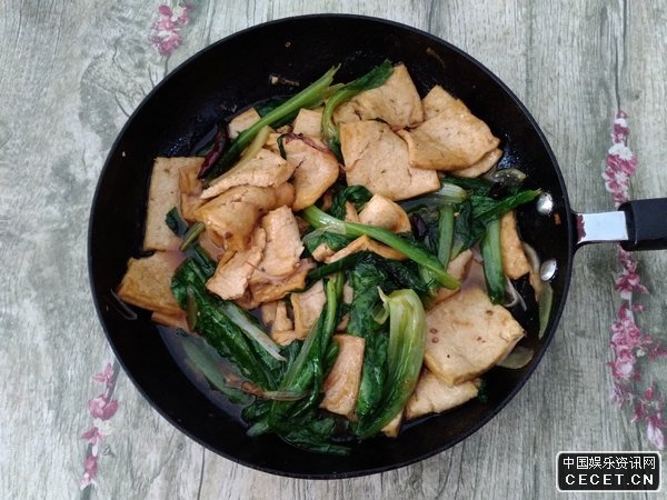 用買(mǎi)來(lái)的豆腐炒了一個(gè)素菜,豆腐較通常在超市買(mǎi)的味道純正。