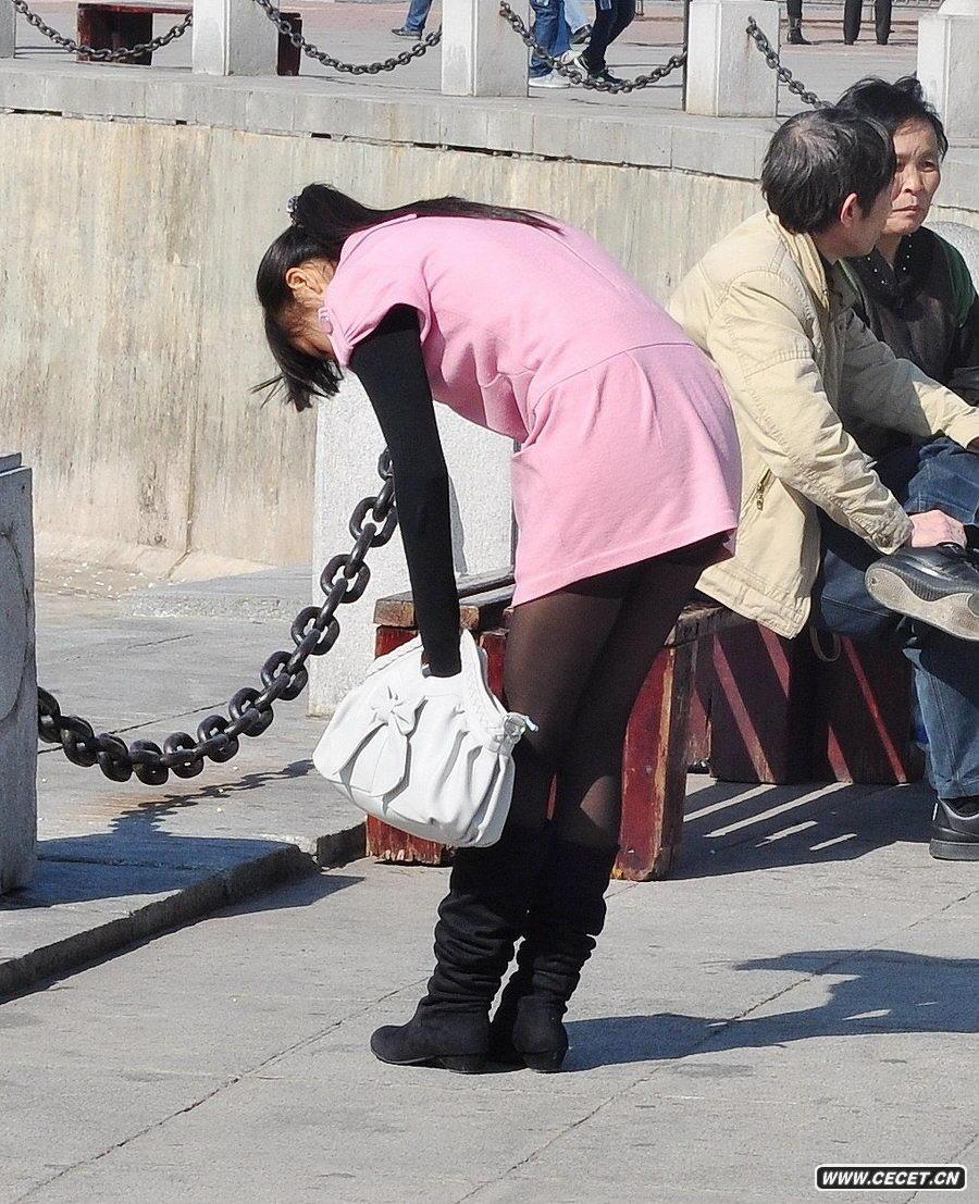 街拍粉裙黑絲襪女生