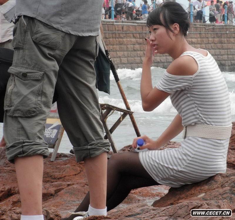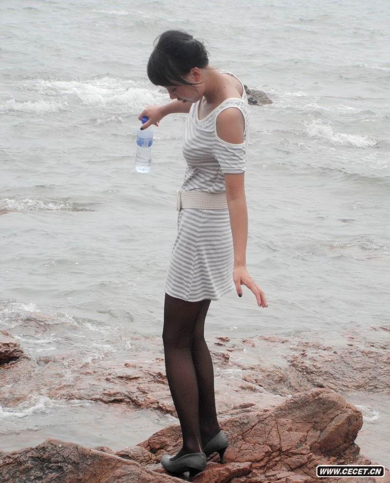 海邊玩耍的黑絲女生