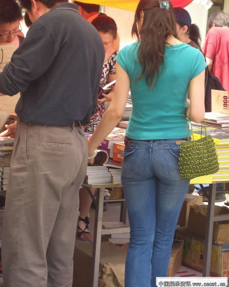 圖書(shū)批發(fā)市場(chǎng)街拍緊身牛仔褲美女