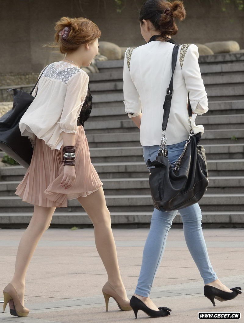五角場(chǎng)街拍上臺階的兩個(gè)美少婦
