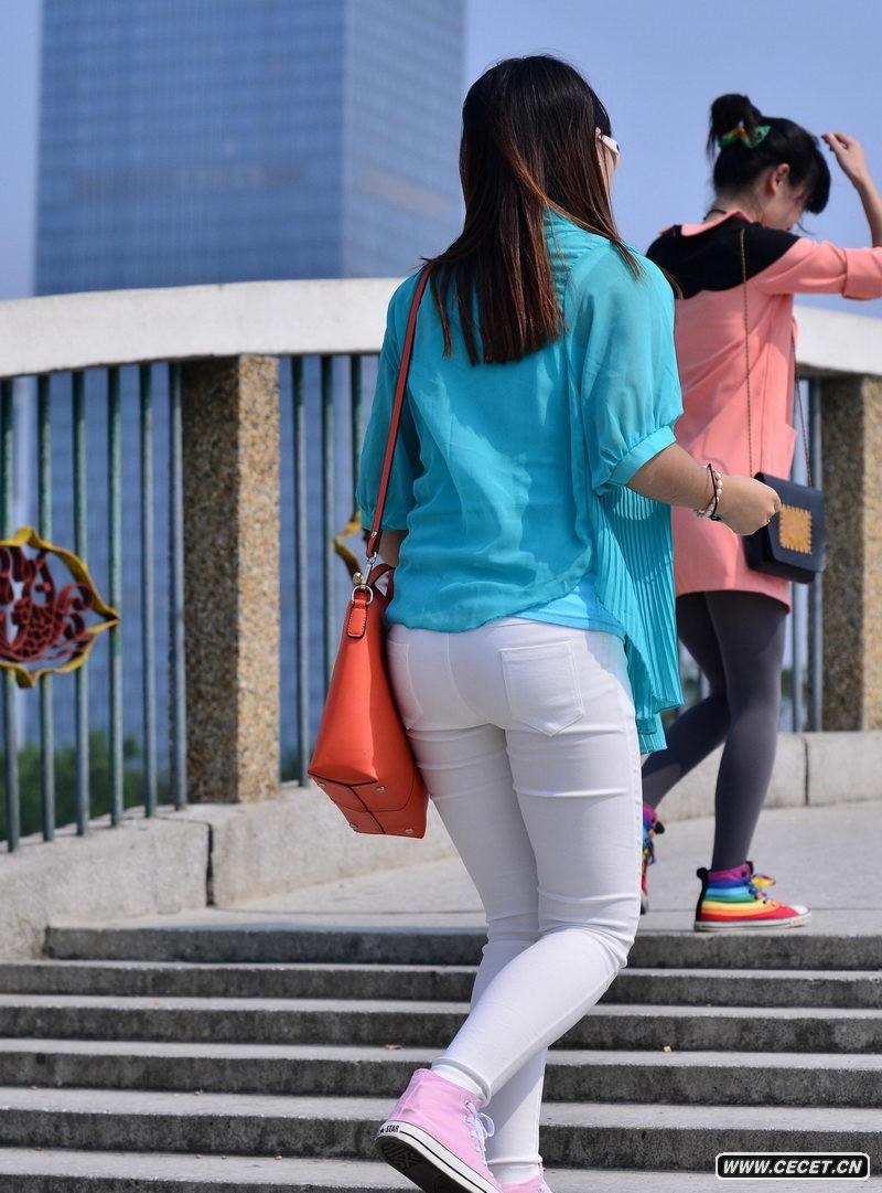 公園湖邊抓拍的白色緊身褲妹妹