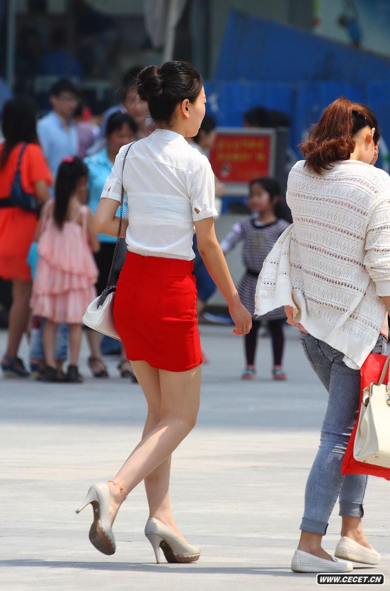 金山廣場(chǎng)街拍紅色空姐裙美女