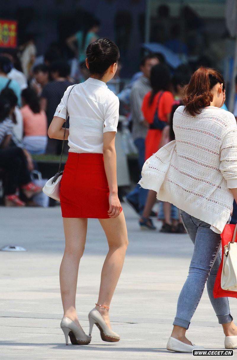金山廣場(chǎng)街拍紅色空姐裙美女
