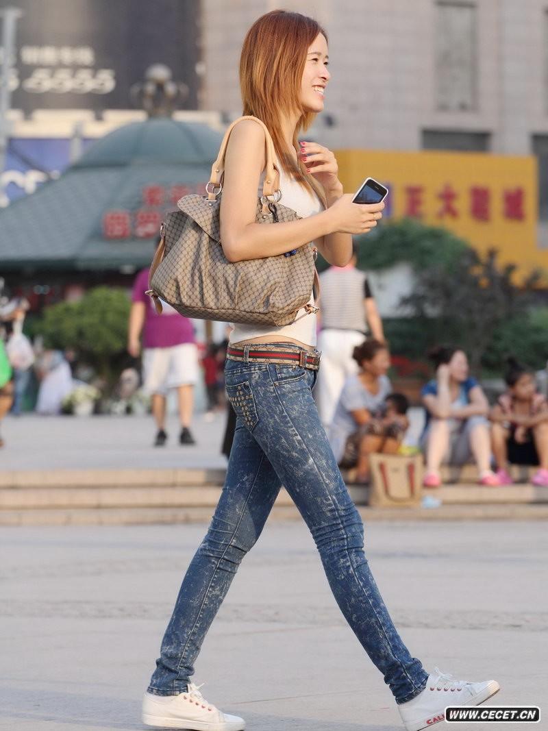 廣場(chǎng)街拍緊身上衣牛仔褲女生
