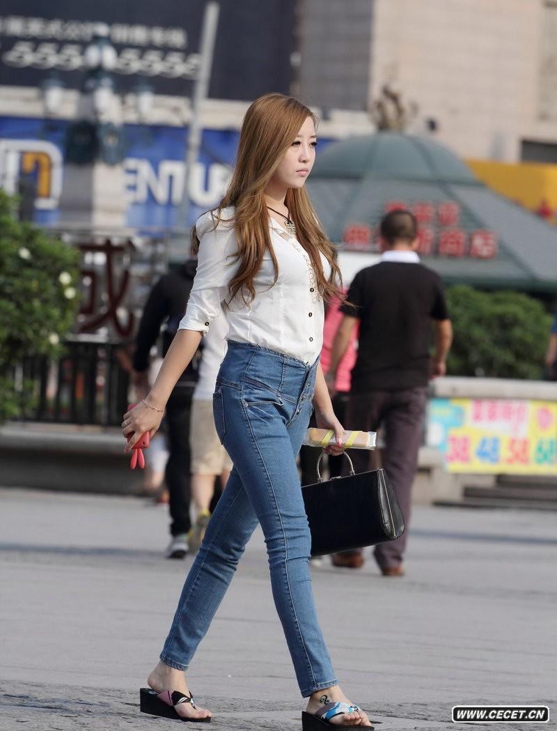 街拍束腰牛仔褲好身材MM