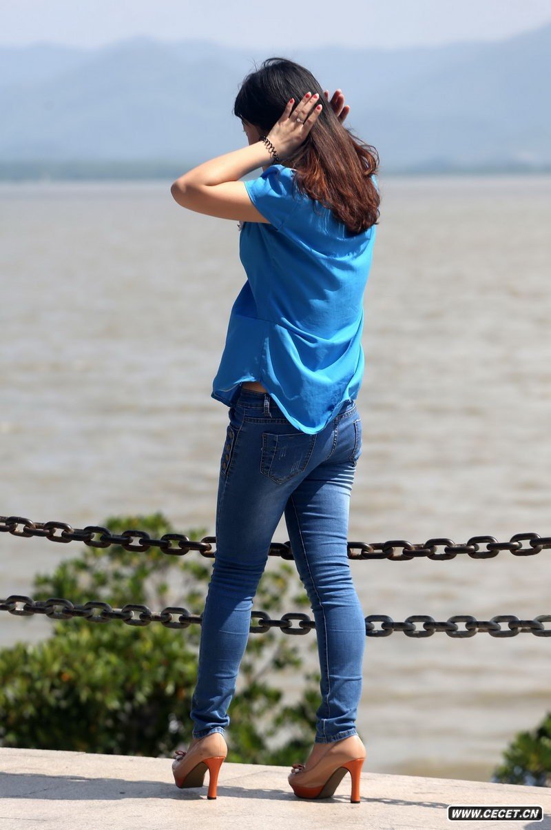 銀沙海灘抓拍的牛仔褲美女
