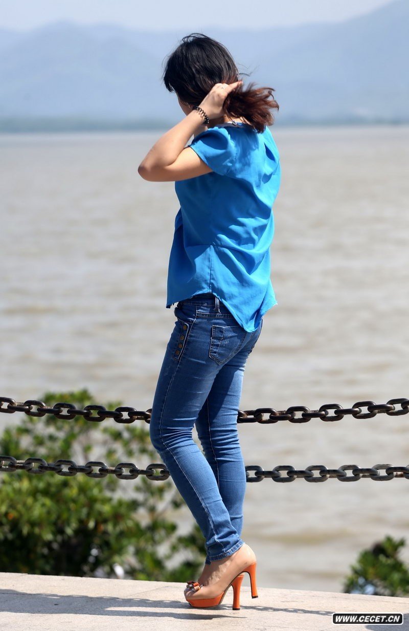 銀沙海灘抓拍的牛仔褲美女