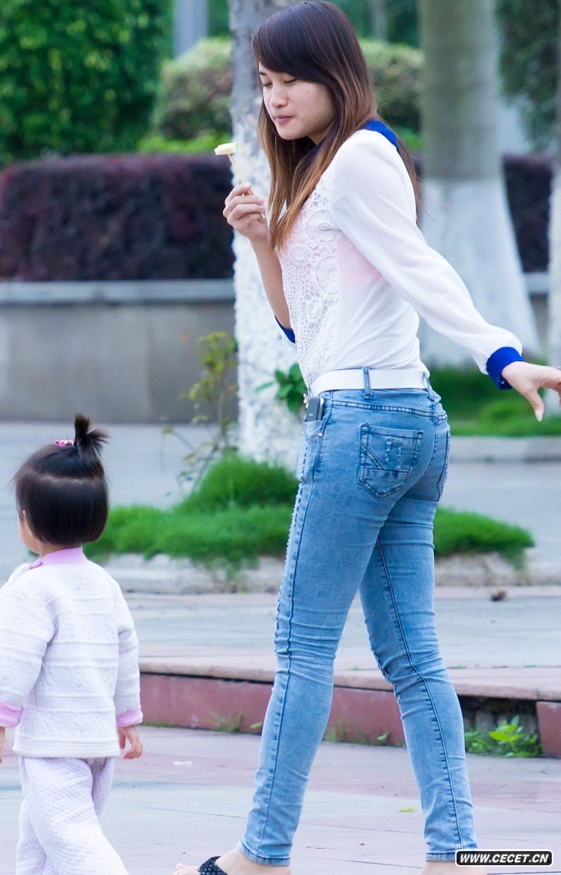 廣場(chǎng)街拍年輕的緊身牛仔褲媽媽