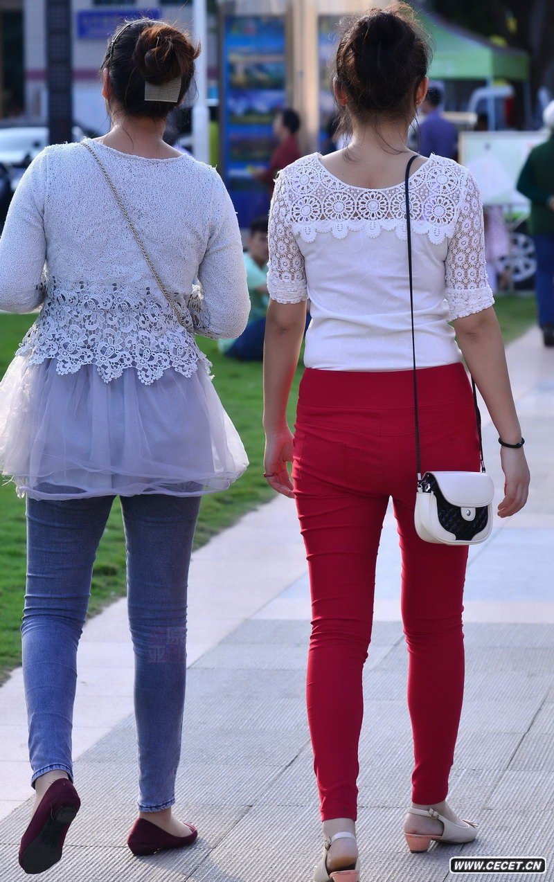 月季公園抓拍的紅色牛仔褲美女