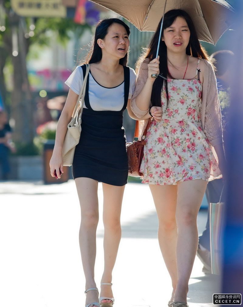 步行街抓拍的兩個(gè)白嫩美腿女生