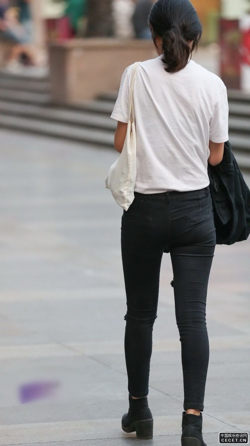 街拍苗條身材黑色緊身褲美女