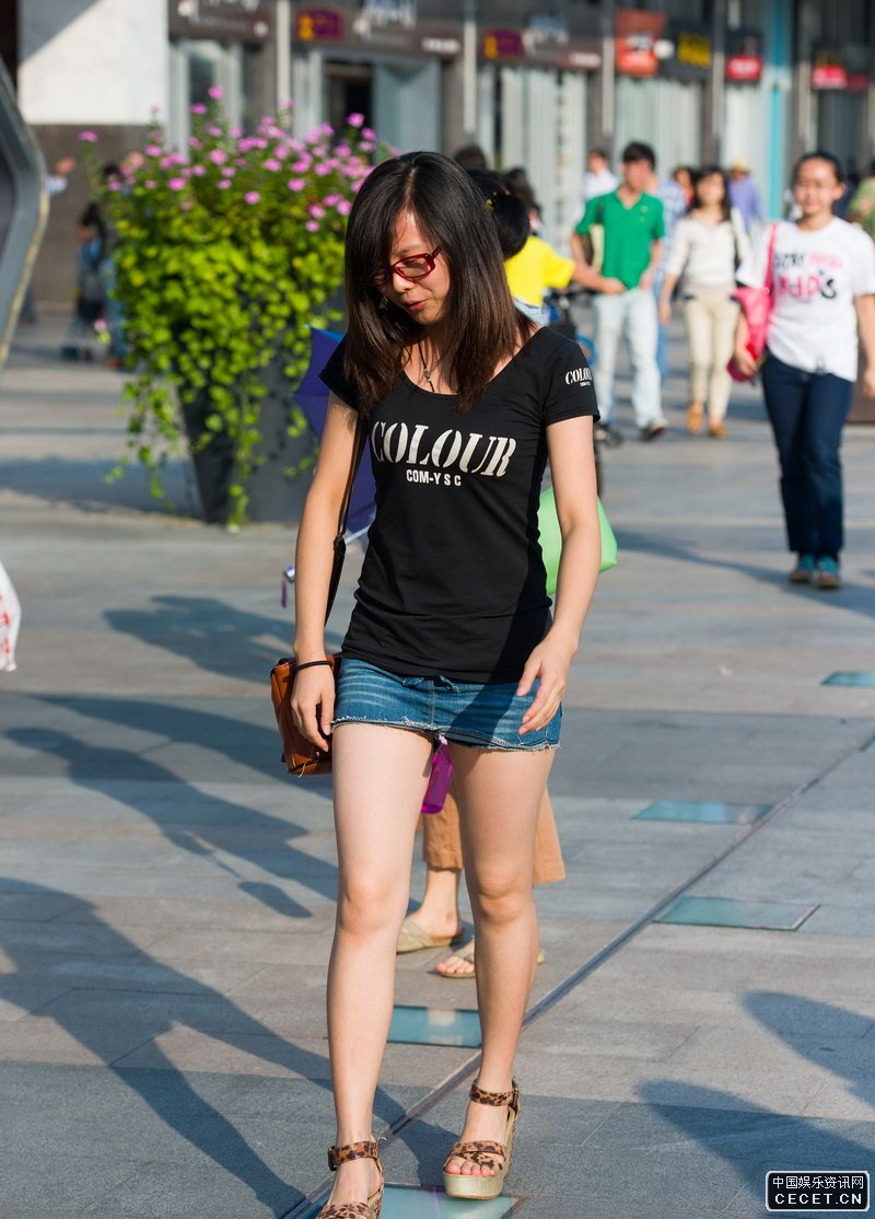 街拍的牛仔短褲裙白腿美眉