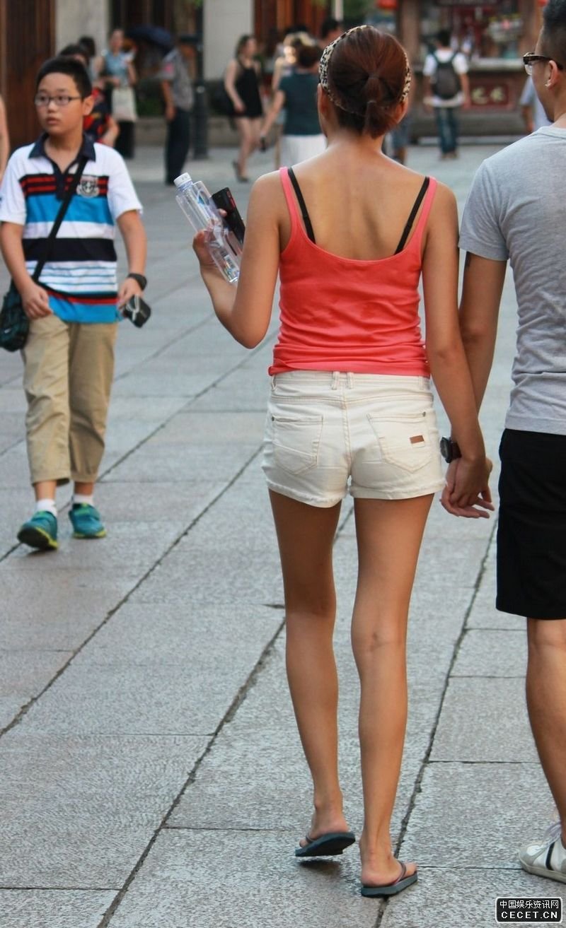 街拍的粉色吊帶白色短褲美女