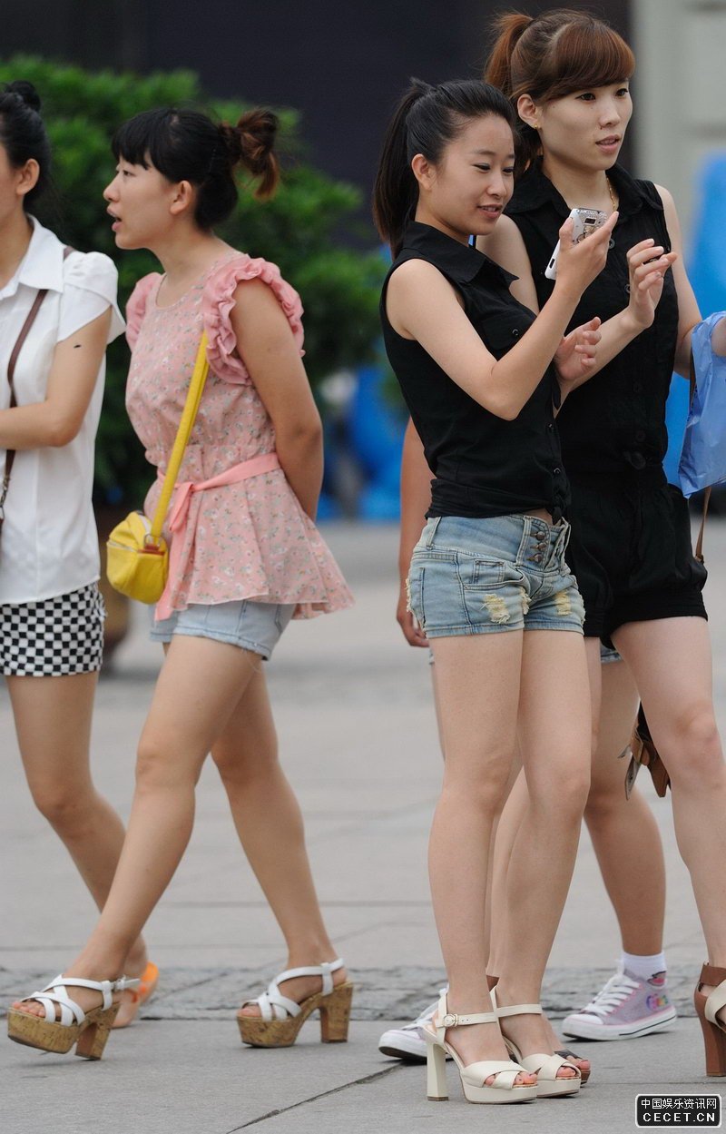 廣場(chǎng)上街拍的牛仔熱褲女生