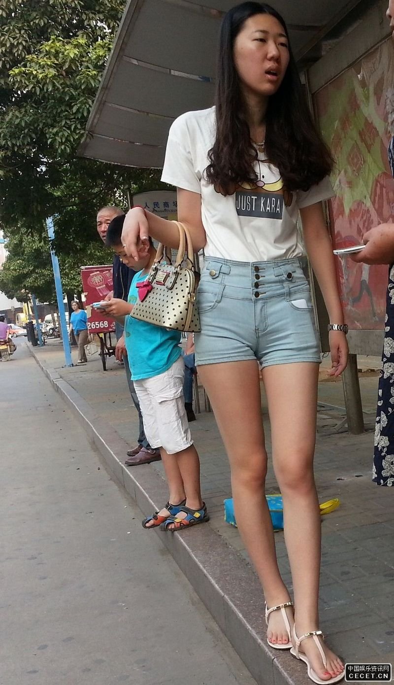 公交車(chē)站抓拍的高腰熱褲妹妹