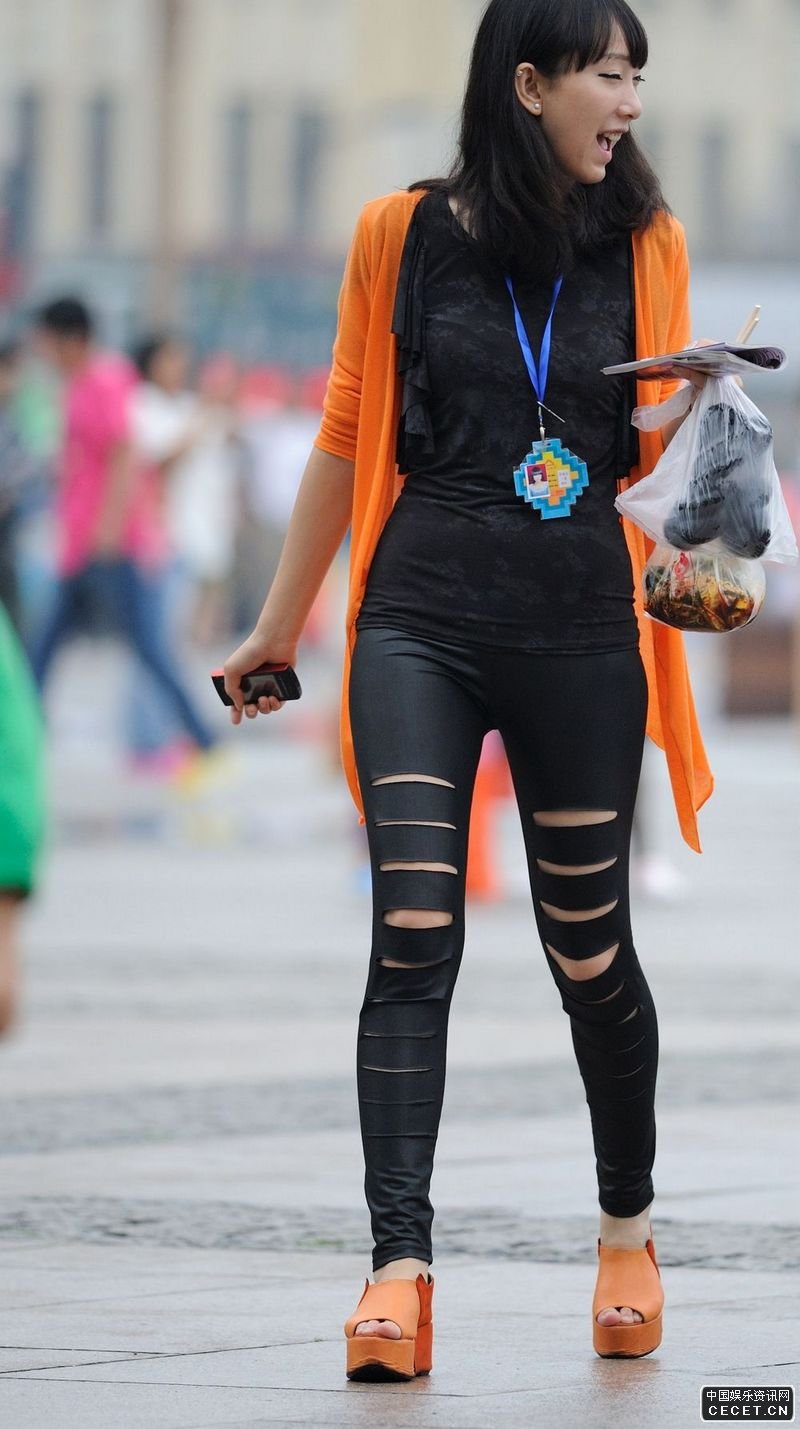 街拍的黑色緊身皮褲清秀妹子