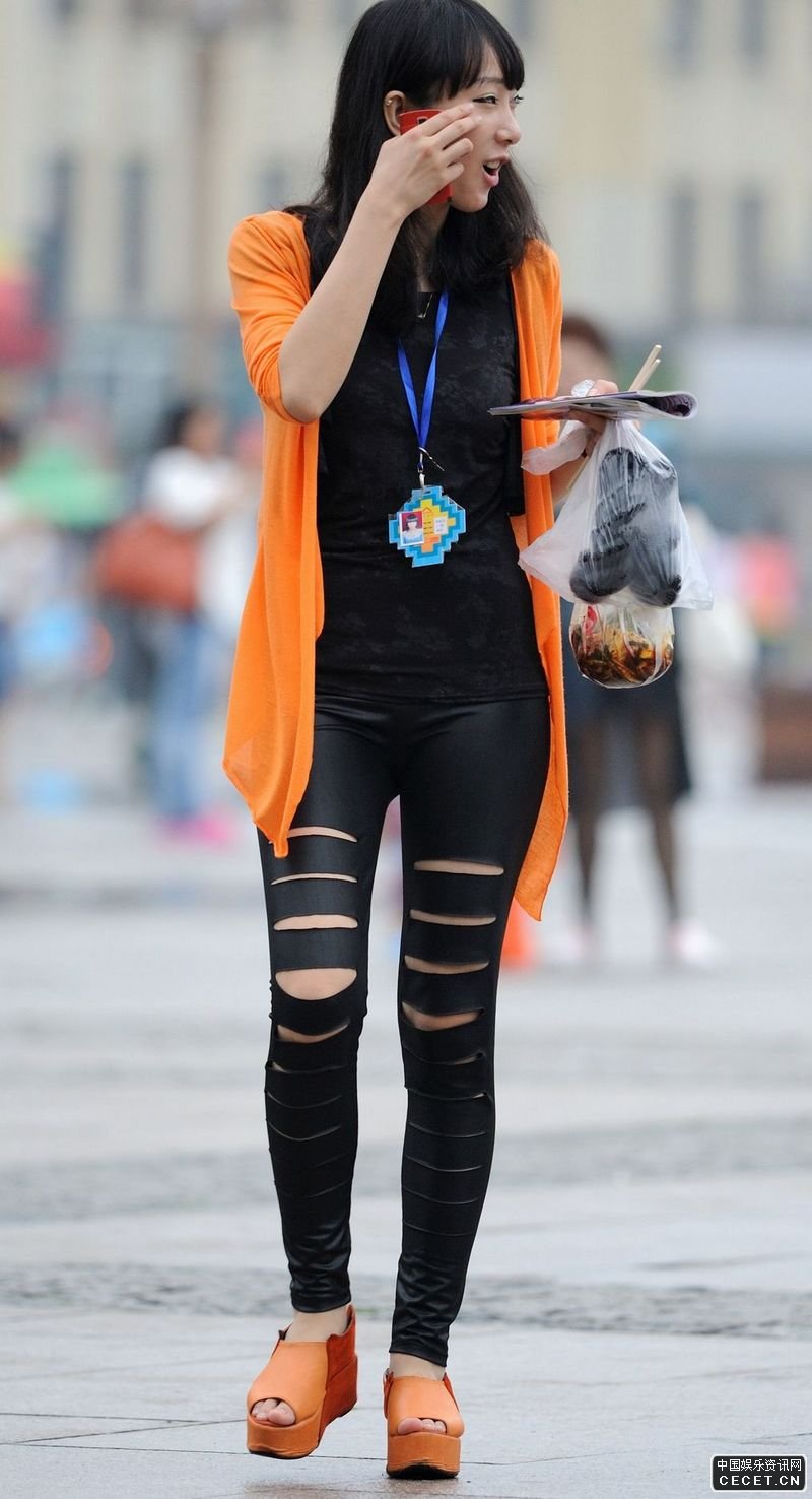 街拍的黑色緊身皮褲清秀妹子