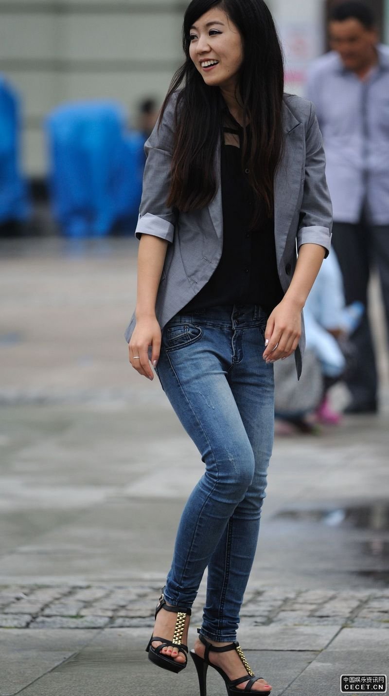 噴泉廣場(chǎng)街拍的時(shí)尚牛仔褲美女