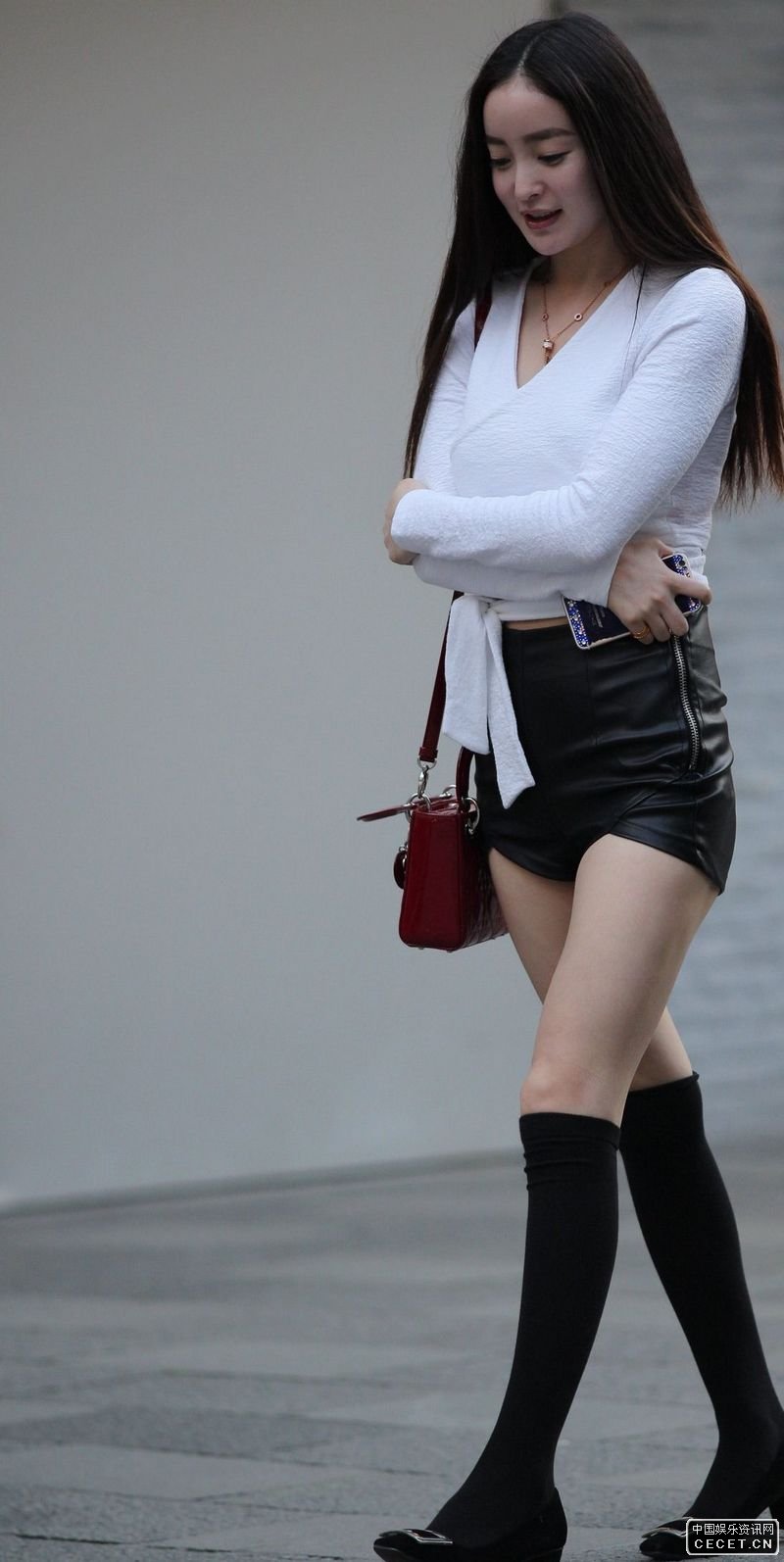 街拍皮質(zhì)短褲長(cháng)筒黑絲襪美女