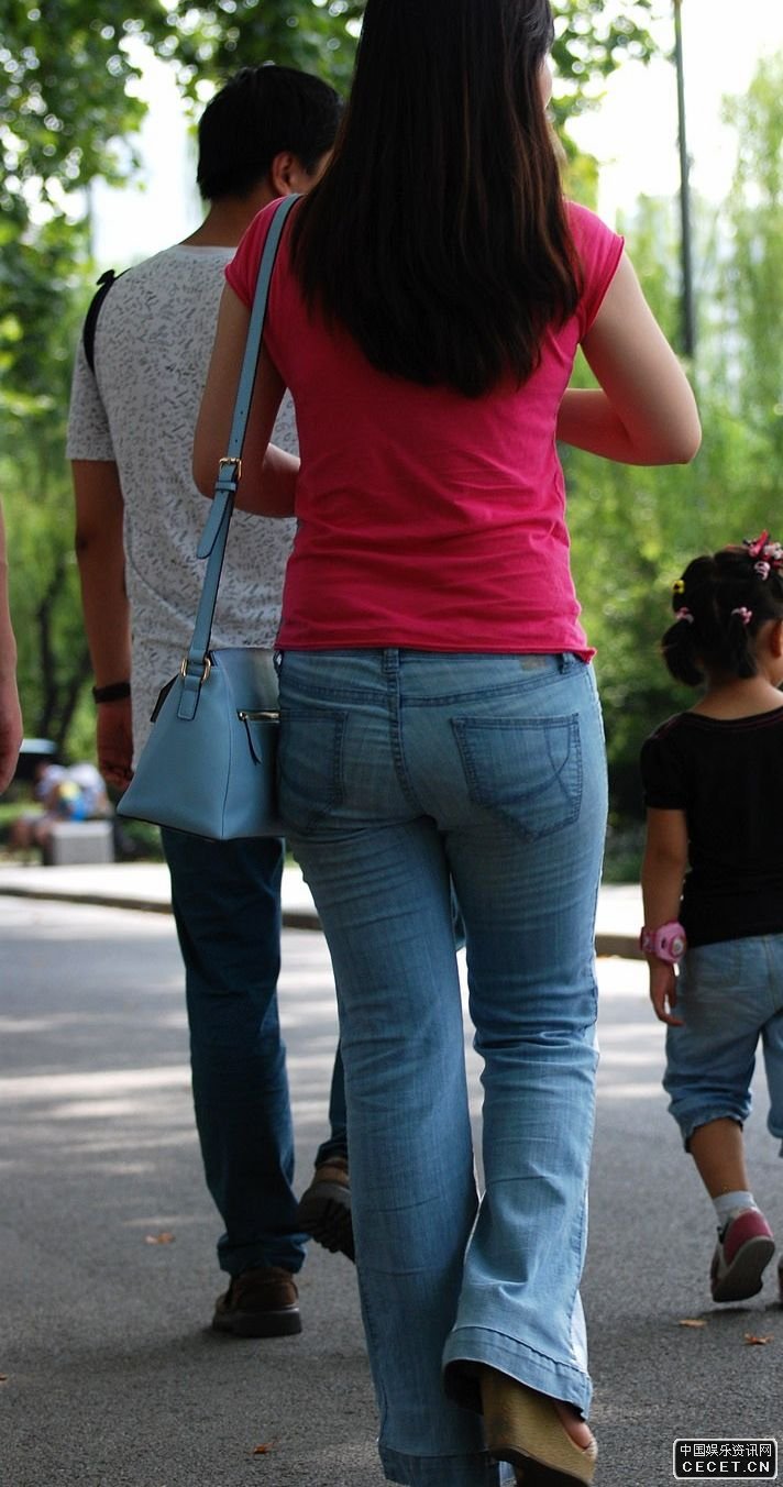 公園里抓拍的粉衣牛仔長(cháng)褲美少婦