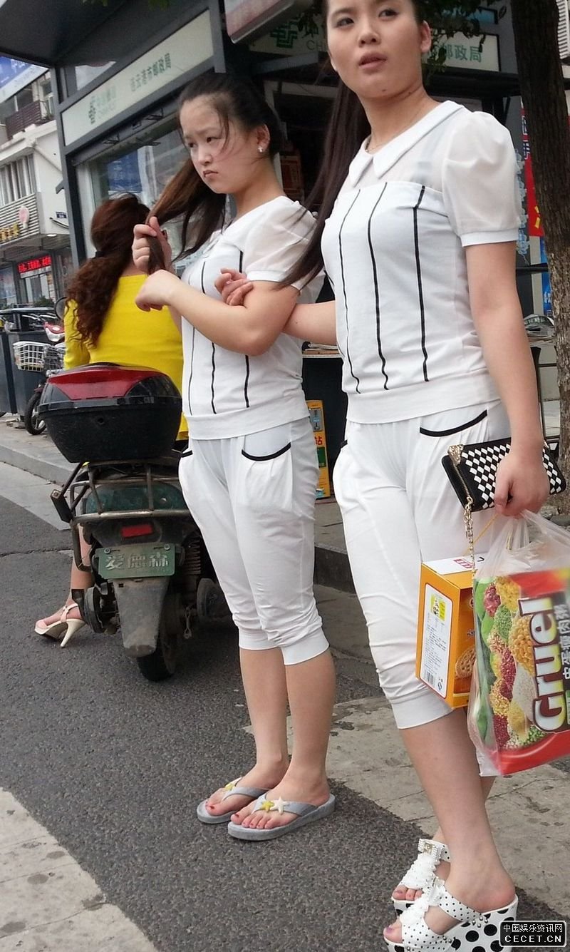 街拍的兩個(gè)緊身白色長(cháng)褲美女