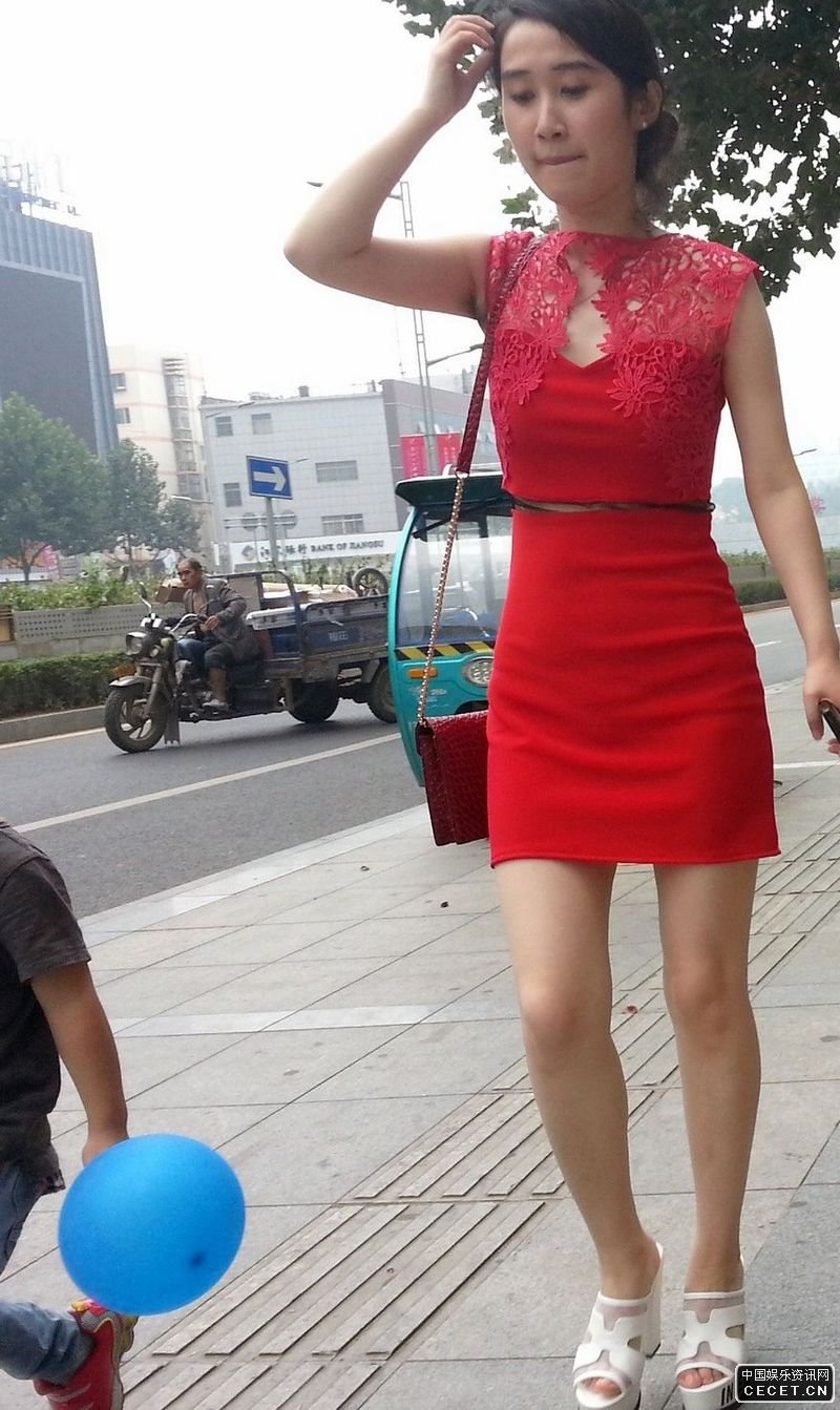 街拍的紅色緊身連衣短裙美女