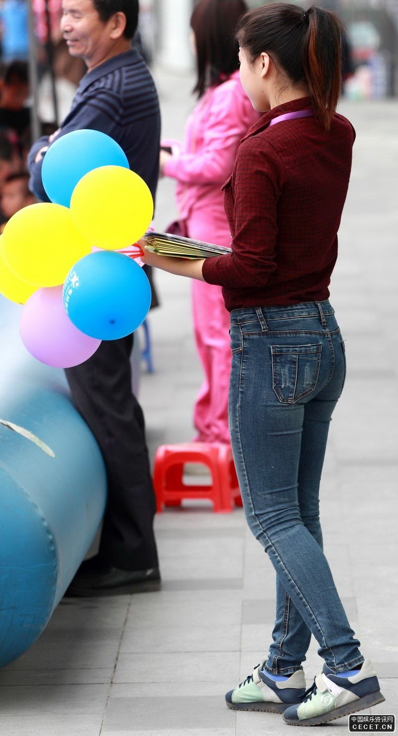 街拍搞促銷(xiāo)的緊身牛仔褲美女
