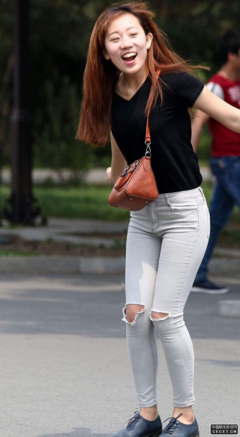 街拍的緊身牛仔破洞褲美女