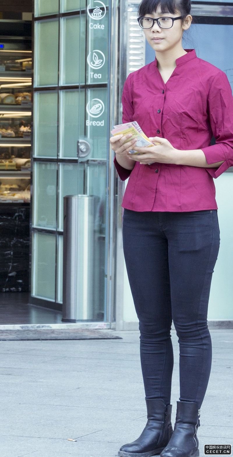 街拍路邊發(fā)傳單的眼鏡美眉