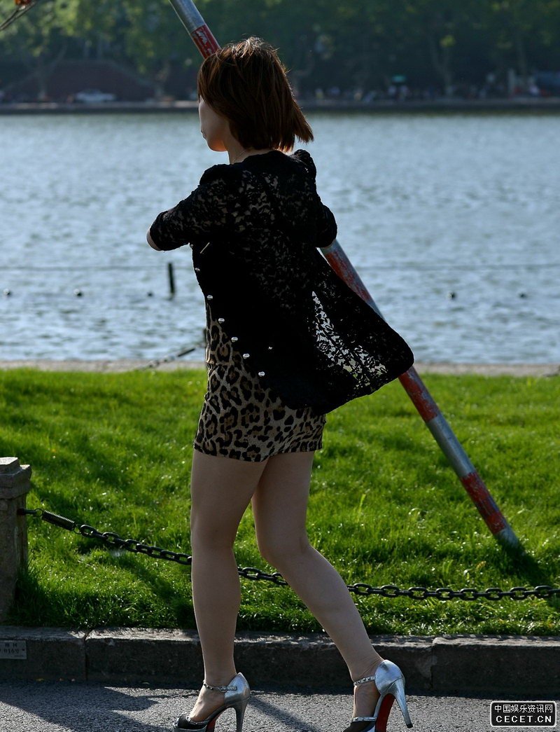 公園湖邊抓拍的豹紋裙美少婦