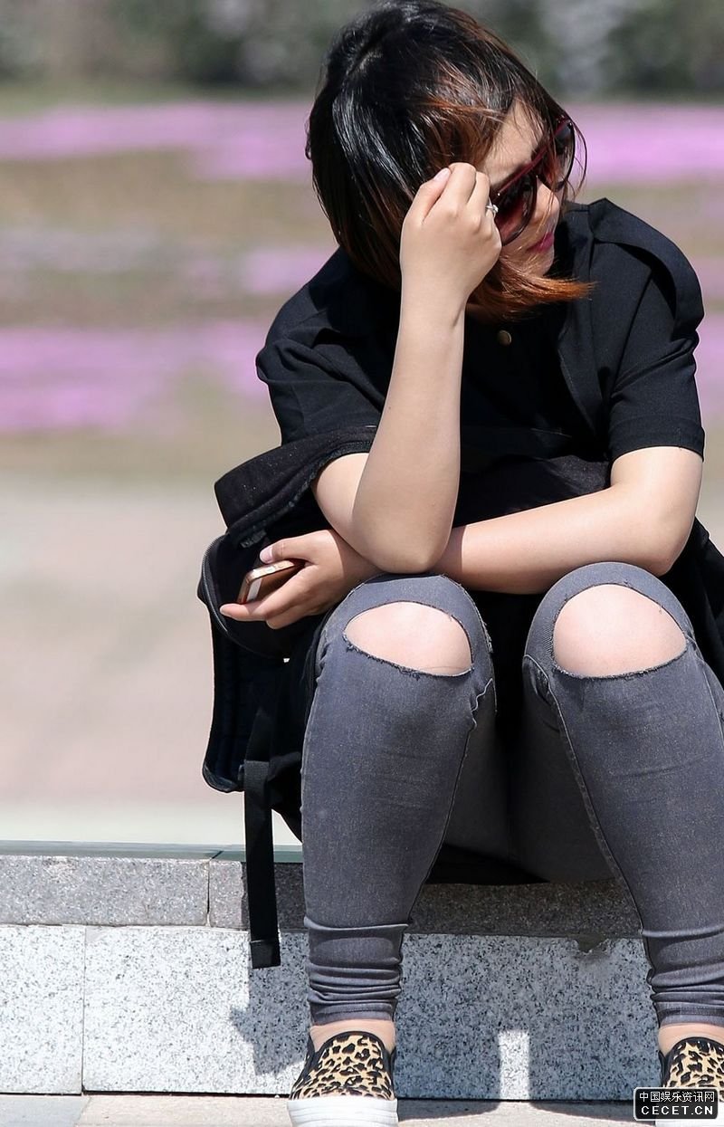 公園臺階抓拍的牛仔褲美女